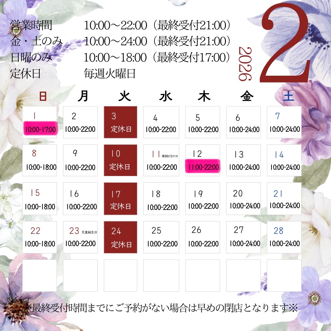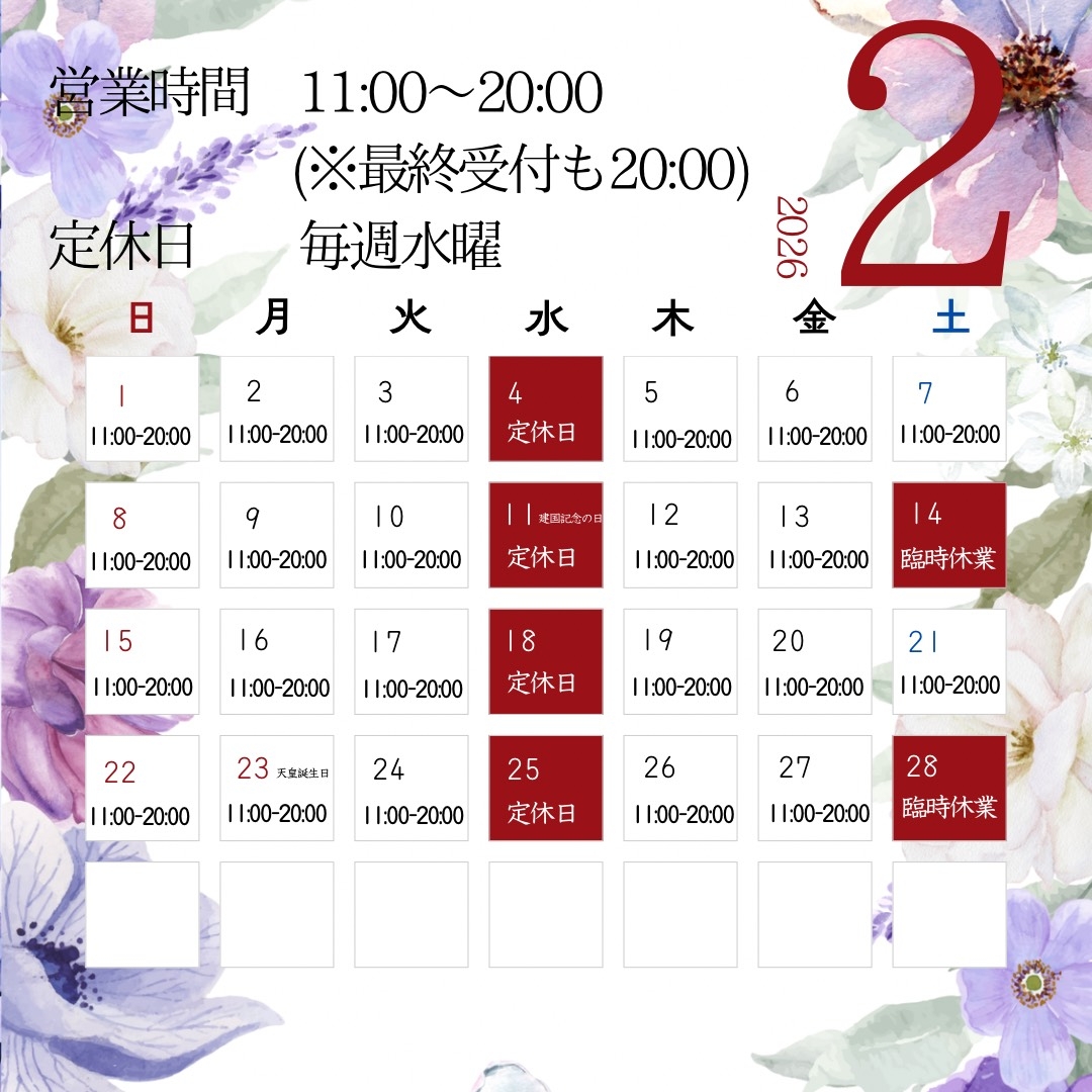 2026年2月“麻布十番店”営業日カレンダー[February 2026 "Azabujuban Store" Business Day Calendar]