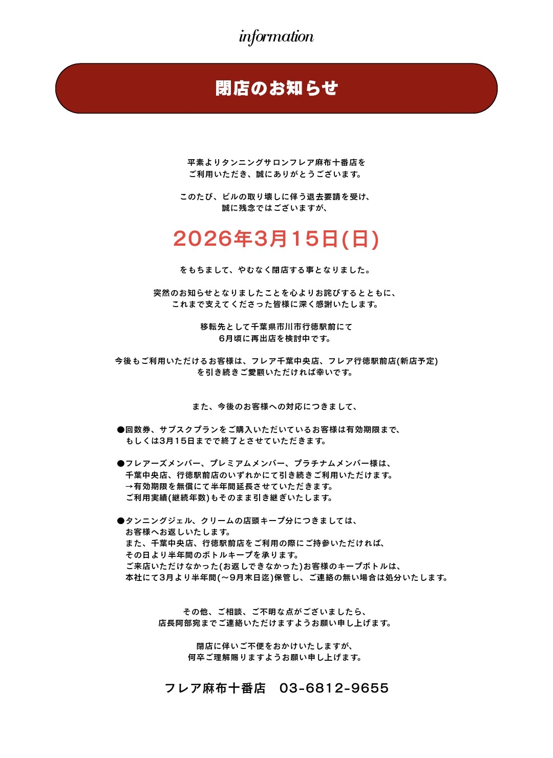 平素よりタンニングサロンフレア麻布十番店をご利用いただき、誠にありがとうございます。