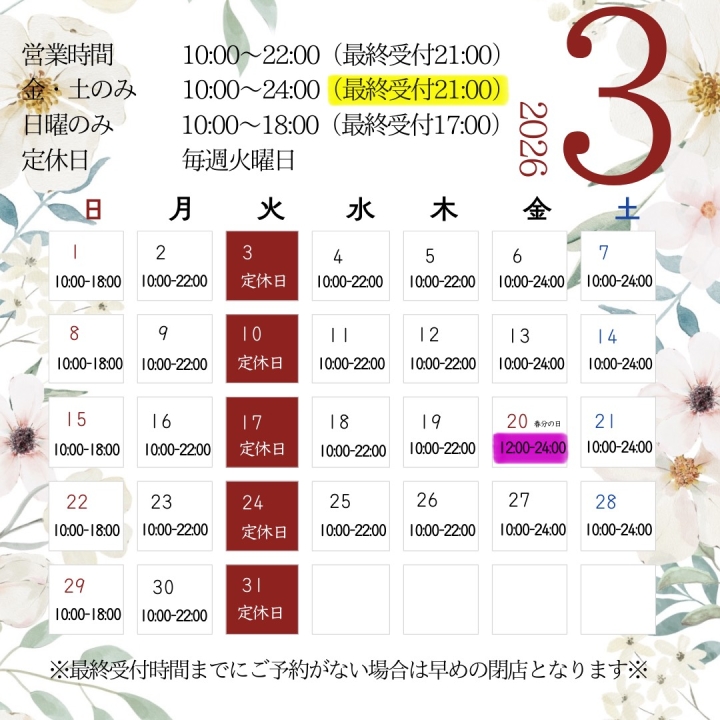 3月20日(金)は営業開始時間が12:00からとなっております。